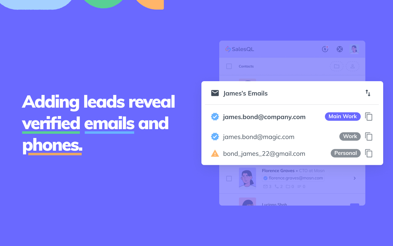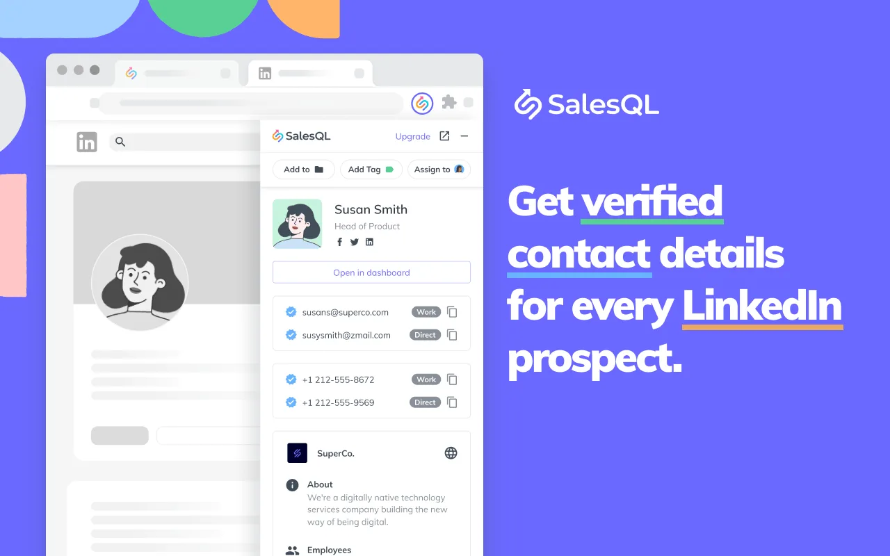 SalesQL is a LinkedIn-first contact discovery and enrichment tool that surfaces verified emails and (where available) direct dials. Use the Chrome extension on profiles and search results, enrich lists in bulk, de-duplicate automatically, and export to CSV or sync to your stack. It tracks reveals, credits, verification confidence, bounce risk, team usage, and list health with audit logs.